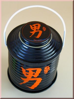Lampionteedose schwarz, männlich mit Stulpdeckel in verschiedenen Farben. Als Teedose oder Aufbewahrungsmöglichkeit für Gewürze, Tee oder Kaffee. Mit einem Henkel zum aufhängen. Die Teedose in schwarzer Farbe ist mit dem chinesischen, männlichen Zeichen versehen.