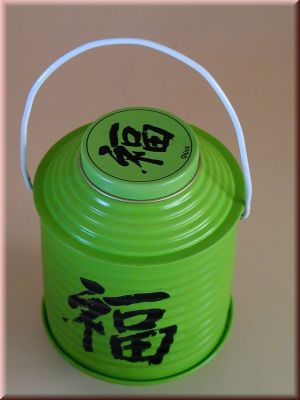 Lampionteedose grün, Glück mit Stulpdeckel in verschiedenen Farben. Als Teedose oder Aufbewahrungsmöglichkeit für Gewürze, Tee oder Kaffee. Mit einem Henkel zum aufhängen. Die Teedose in grüner Farbe ist mit dem chinesischen Zeichen für Glück versehen.