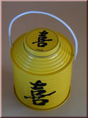 Lampionteedose gelb, Freude mit Stulpdeckel in verschiedenen Farben. Als Teedose oder Aufbewahrungsmöglichkeit für Gewürze, Tee oder Kaffee. Mit einem Henkel zum aufhängen. Die Teedose in gelber Farbe ist mit dem chinesischen Zeichen für Freude versehen.